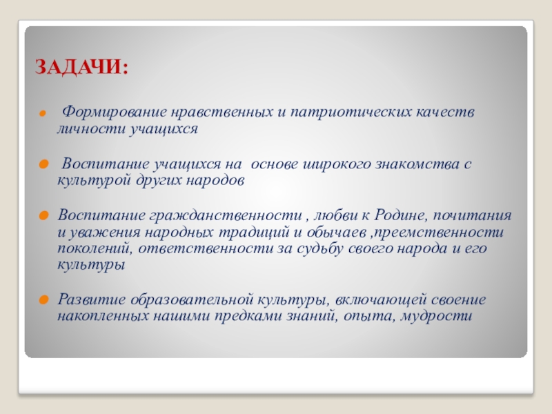 ЗАДАЧИ: Формирование нравственных и патриотических качеств личности учащихся Воспитание учащихся на основе широкого знакомства с культурой других