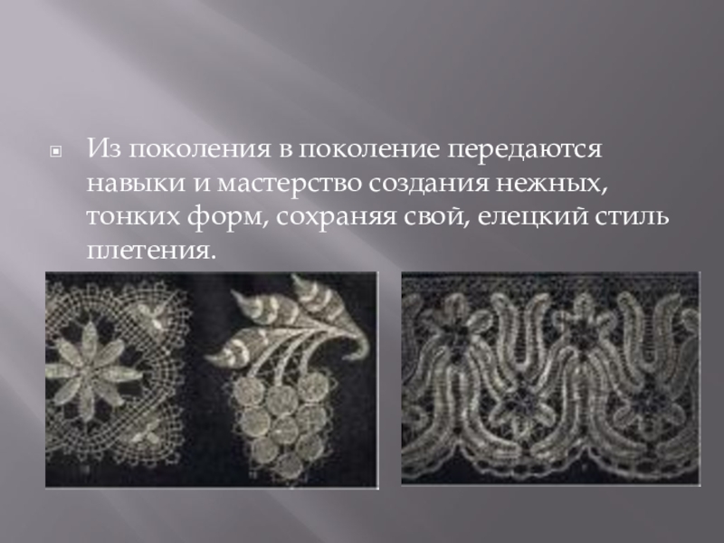 Из поколения в поколение передаются навыки и мастерство создания нежных, тонких форм, сохраняя свой, елецкий стиль плетения.