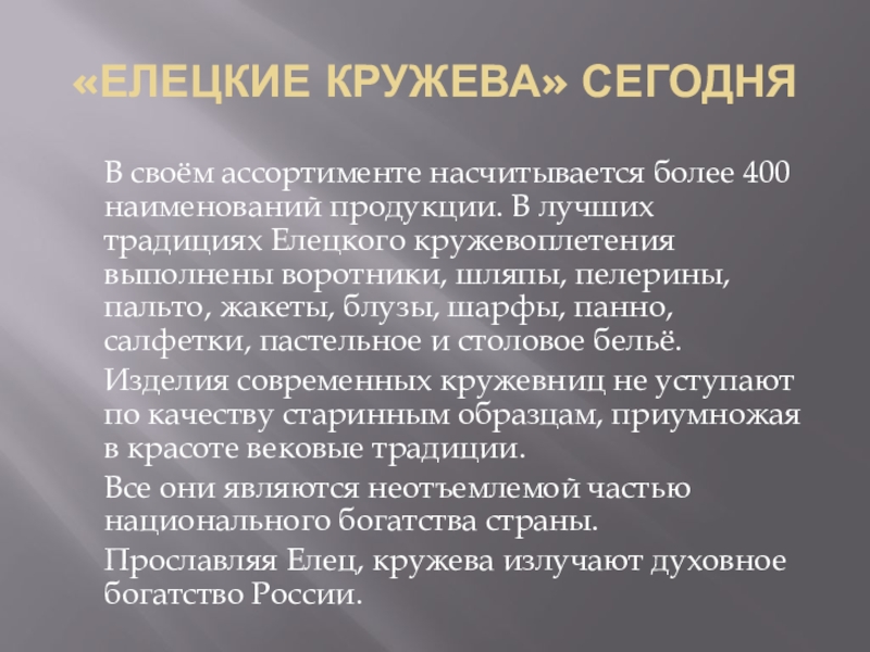 «ЕЛЕЦКИЕ КРУЖЕВА» СЕГОДНЯ   В своём ассортименте насчитывается более 400 наименований продукции. В лучших традициях Елецкого