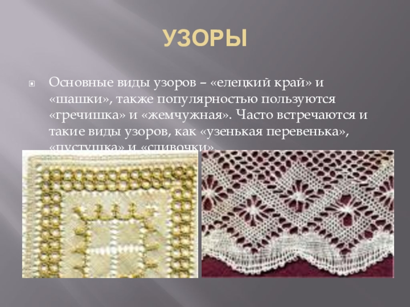 УЗОРЫОсновные виды узоров – «елецкий край» и «шашки», также популярностью пользуются «гречишка» и «жемчужная». Часто встречаются и