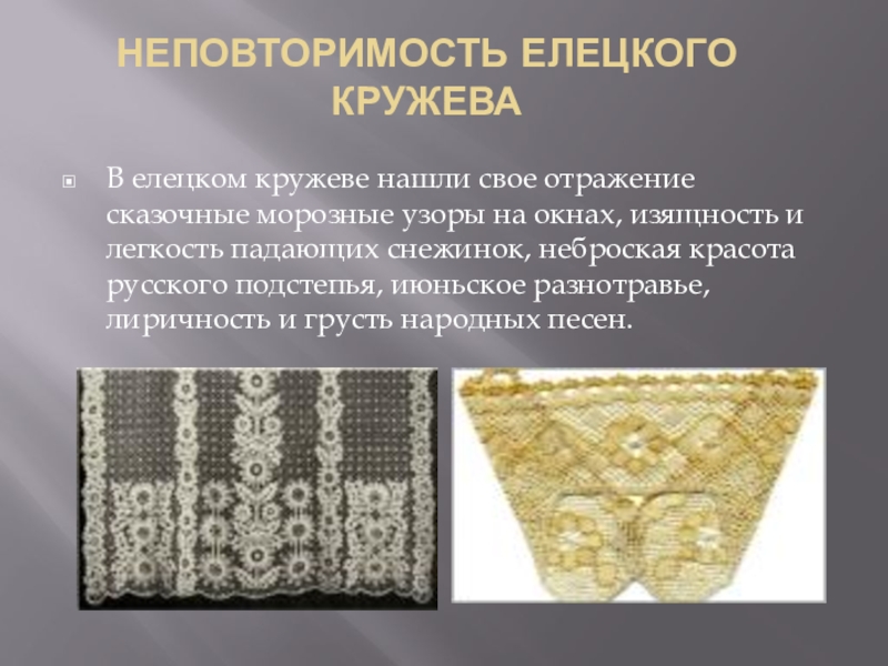 Слайд 6НЕПОВТОРИМОСТЬ ЕЛЕЦКОГО КРУЖЕВА
