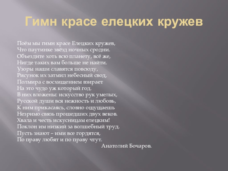 Гимн красе елецких кружевПоём мы гимн красе Елецких кружев,Что паутинке звёзд ночных сродни.Объездите хоть всю планету, всё
