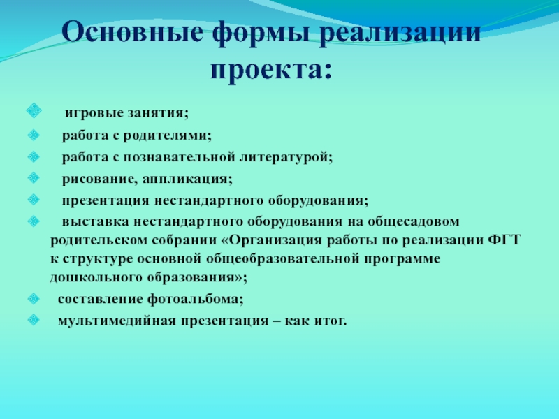 выставка нестандартного оборудования на общесадовом родительском собрании «Организация работы по реализации ФГТ к структуре основной общеобразовательной программе дошкольного образования»;