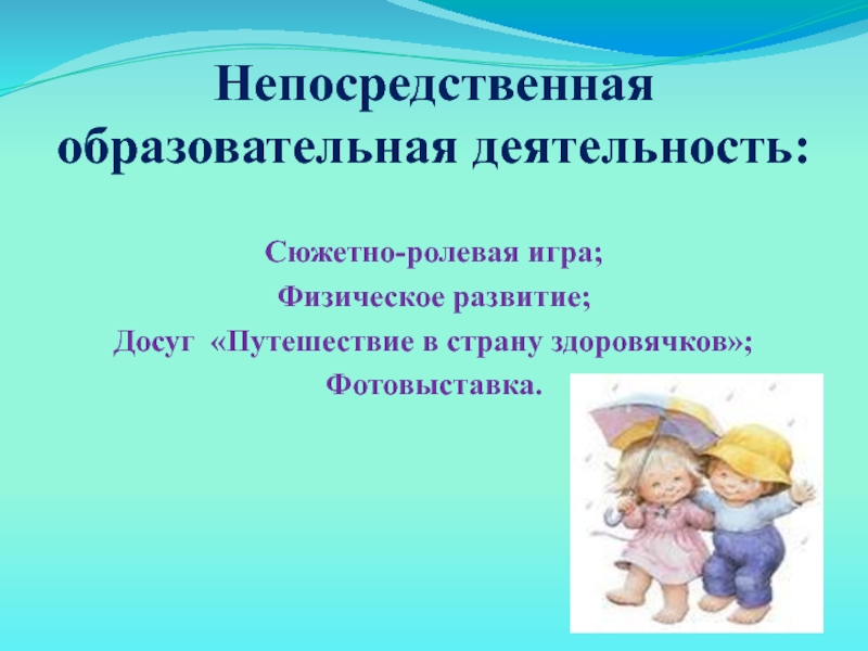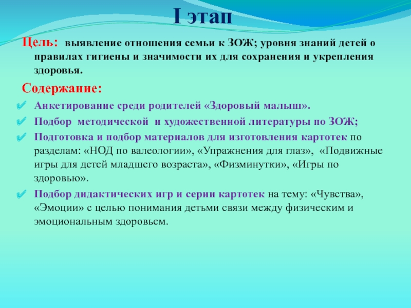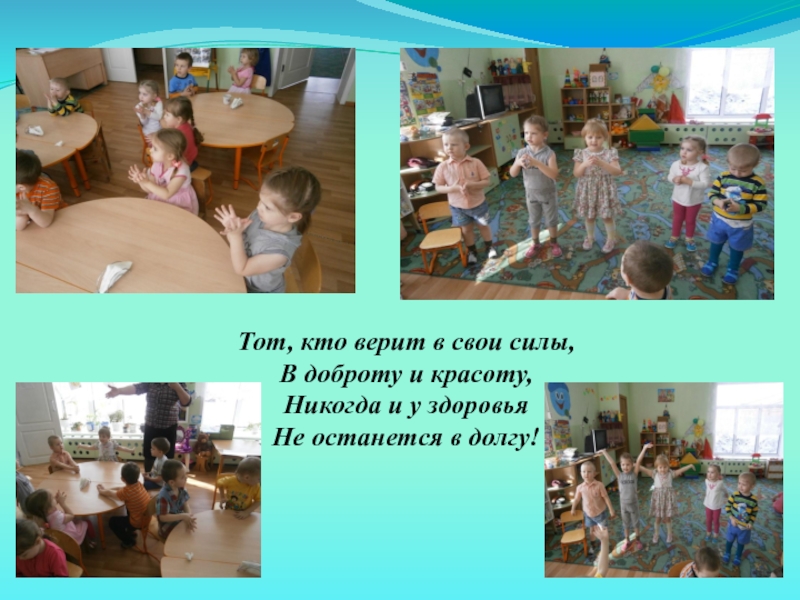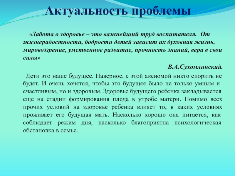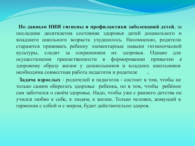 Задача взрослых - родителей и педагогов - состоит в том, чтобы не только самим оберегать здоровье ребенка, но в том, чтобы ребёнок сам заботился о своём здоровье. Надо, чтобы уже с раннего детства он учился любви к себе, к людям, к жизни. Только человек, живущий в гармонии с собой и с миром, будет действительно здоров.