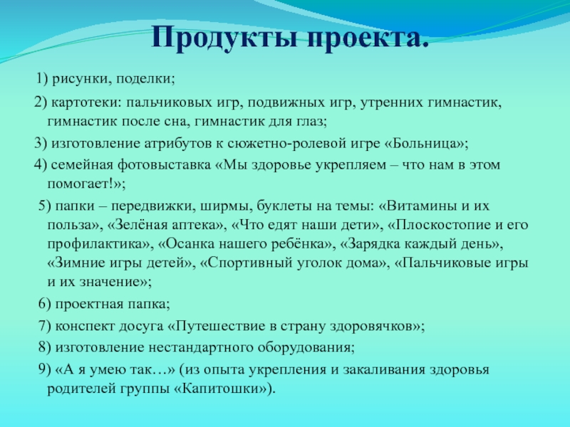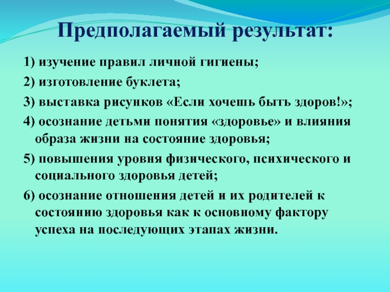 6) осознание отношения детей и их родителей к состоянию здоровья как к основному фактору успеха на последующих этапах жизни.