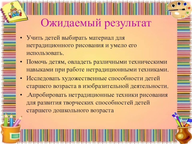 .Апробировать нетрадиционные техники рисования для развития творческих способностей детей старшего дошкольного возраста