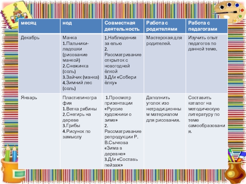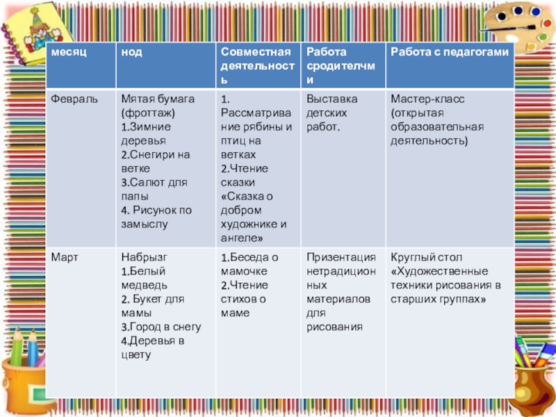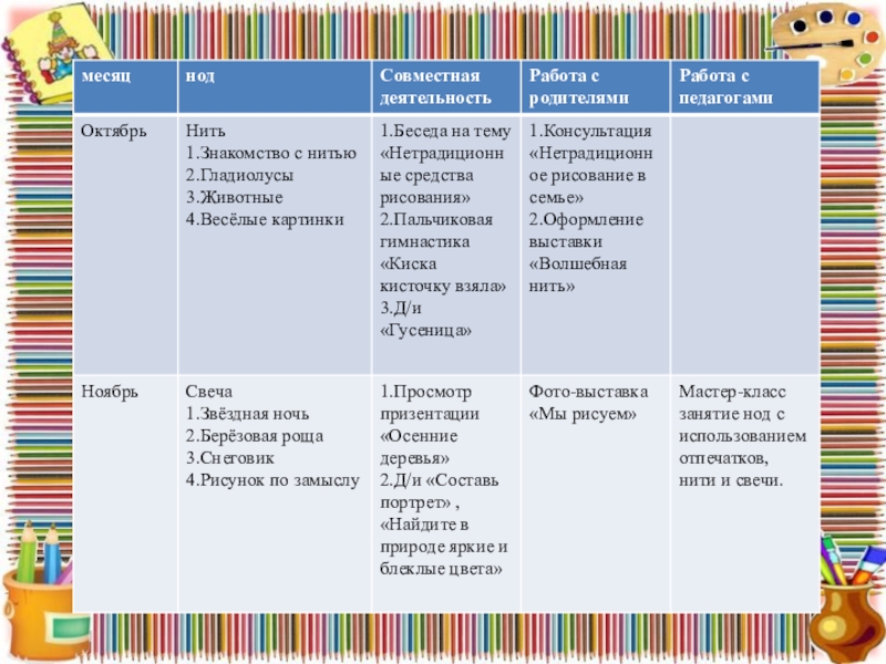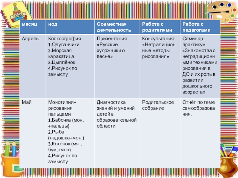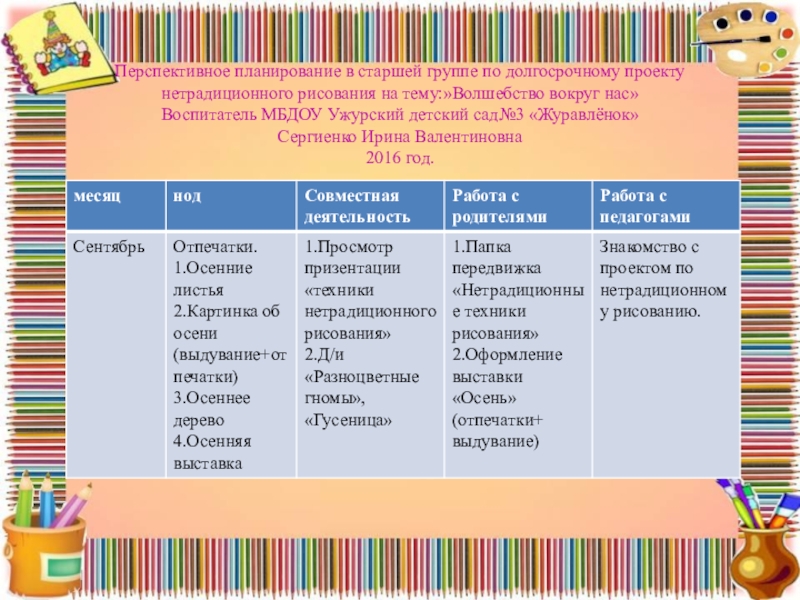 Слайд 9Перспективное планирование в старшей группе по долгосрочному проекту нетрадиционного рисования на