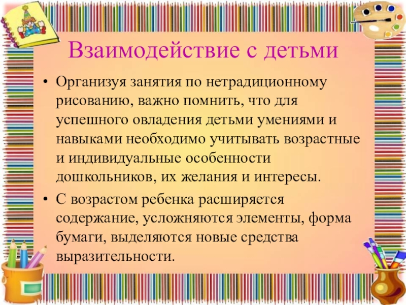 Организуя занятия по нетрадиционному рисованию, важно помнить, что для успешного овладения детьми умениями и навыками необходимо учитывать возрастные и индивидуальные особенности дошкольников, их желания и интересы.