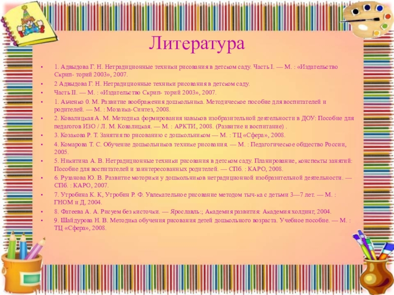 1. Адвыдова Г. Н. Нетрадиционные техники рисования в детском саду. Часть