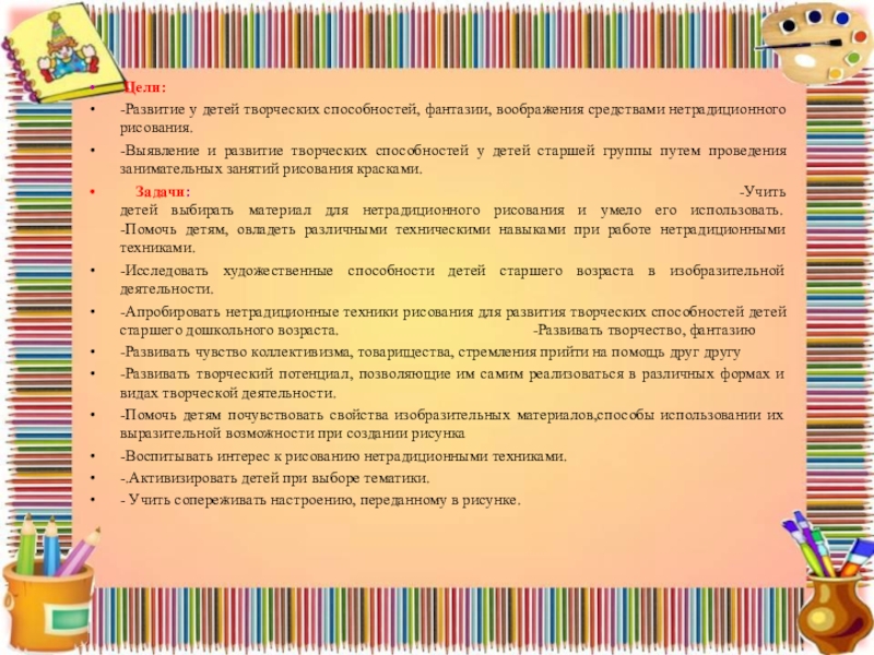 -Развитие у детей творческих способностей, фантазии, воображения средствами нетрадиционного рисования.