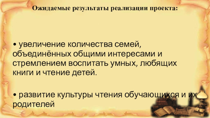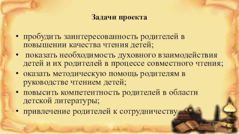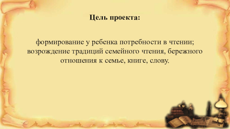 формирование у ребенка потребности в чтении; возрождение традиций семейного чтения,