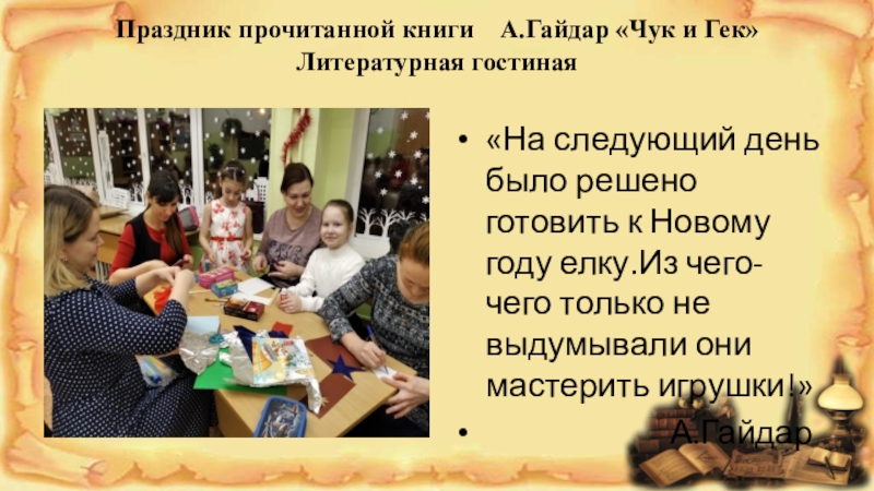 Слайд 13Праздник прочитанной книги А.Гайдар «Чук и Гек»