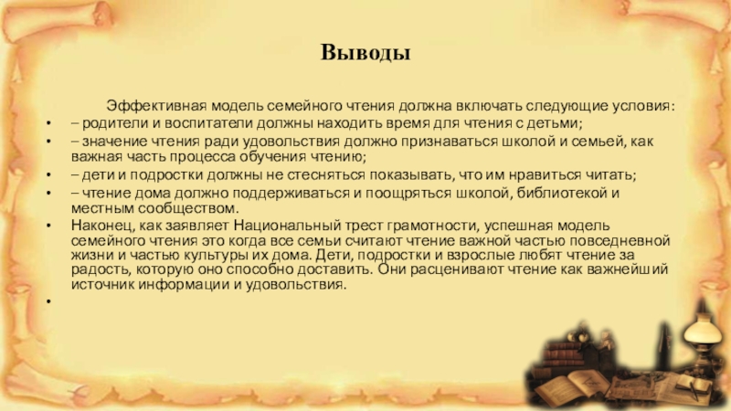 Наконец, как заявляет Национальный трест грамотности, успешная модель семейного чтения это когда все семьи считают чтение важной частью повседневной жизни и частью культуры их дома. Дети, подростки и взрослые любят чтение за радость, которую оно способно доставить. Они расценивают чтение как важнейший источник информации и удовольствия.