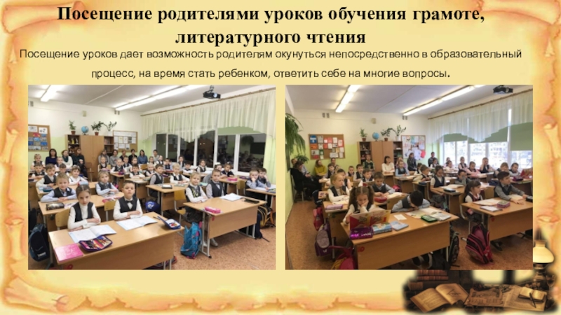 Слайд 20Посещение родителями уроков обучения грамоте, литературного чтения