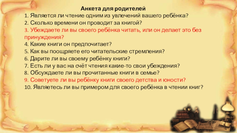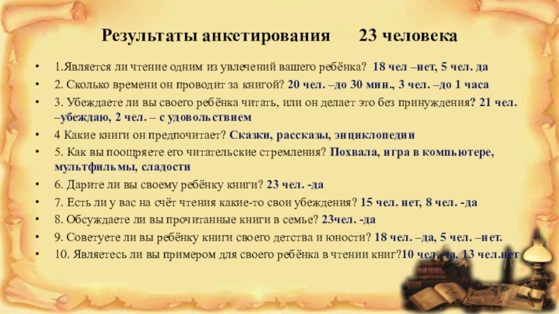 10. Являетесь ли вы примером для своего ребёнка в чтении книг?10 чел.-да, 13 чел.нет