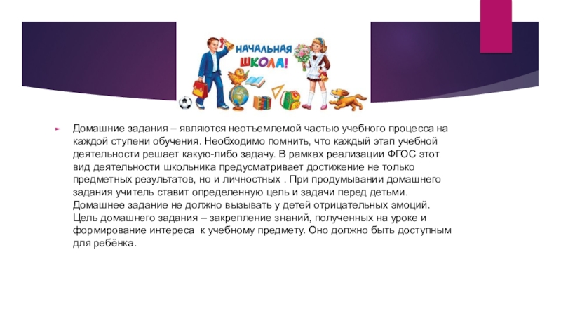 Слайд 2Домашние задания – являются неотъемлемой частью учебного процесса на каждой ступени