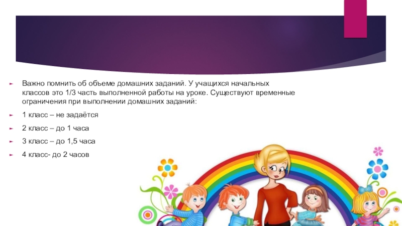 Слайд 6Важно помнить об объеме домашних заданий. У учащихся начальных классов это