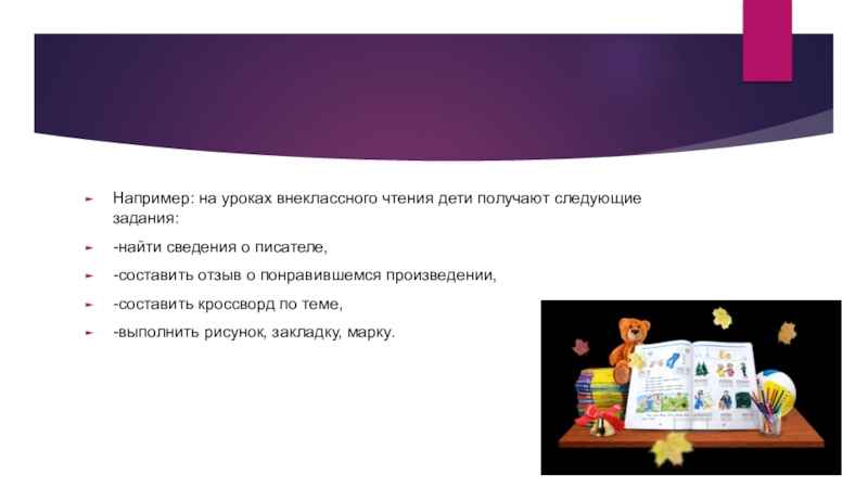 Слайд 5Например: на уроках внеклассного чтения дети получают следующие задания: