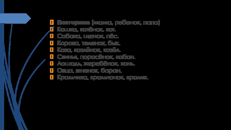 Повторяем (мама, ребенок, папа)Кошка, котёнок, кот.Собака, щенок, пёс.Корова, теленок, бык.Коза, козлёнок, козёл.Свинья, поросёнок, кабан.Лошадь, жеребёнок, конь.Овца, ягненок,