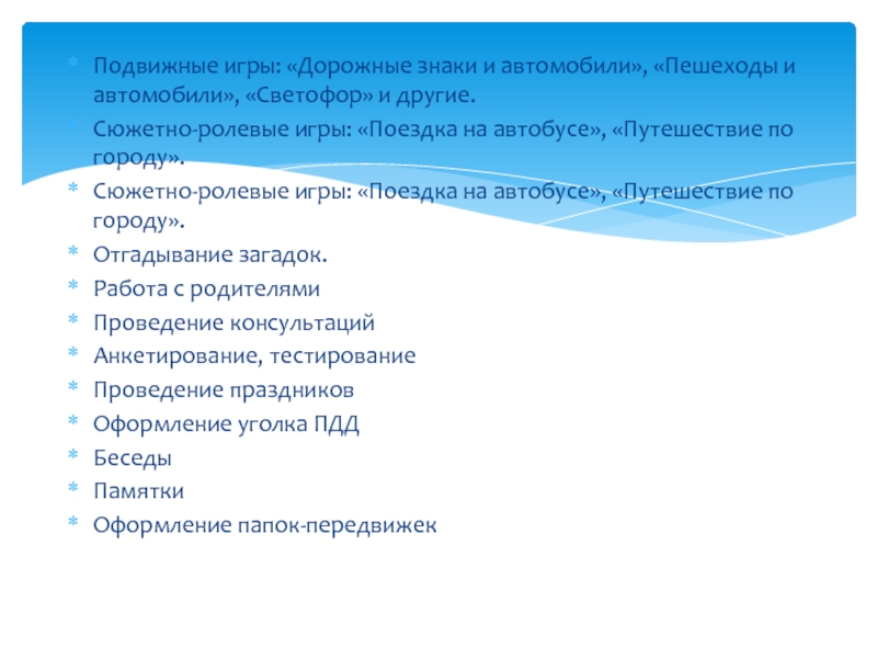 Дидактические игры: «Будь внимательным», «Виды перекрестков», «Доскажи словечко», «Наша улица», «Поставь дорожный знак», «Правильно разложи», «Светофор», «Угадай-ка», «Узнай по описанию», «Это я, это я, это все мои друзья!».