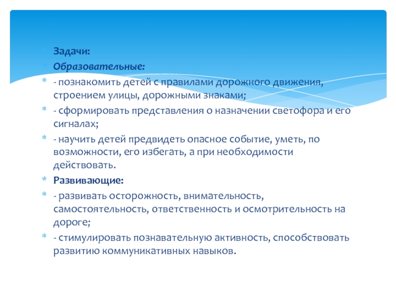 - познакомить детей с правилами дорожного движения, строением улицы, дорожными знаками;