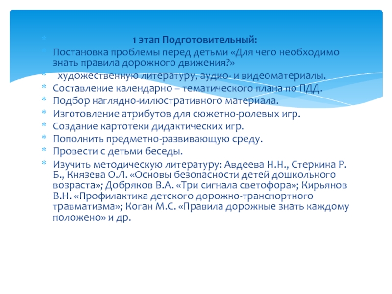 Изучить методическую литературу: Авдеева Н.Н., Стеркина Р.Б., Князева О.Л. «Основы безопасности детей дошкольного возраста»; Добряков В.А. «Три сигнала светофора»; Кирьянов В.Н. «Профилактика детского дорожно-транспортного травматизма»; Коган М.С. «Правила дорожные знать каждому положено» и др.