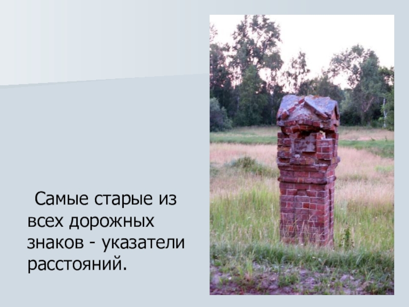 Слайд 7 Самые старые из всех дорожных знаков - указатели расстояний.