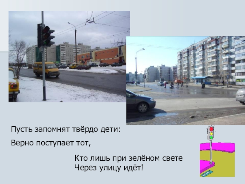 Пусть запомнят твёрдо дети:Верно поступает тот,Кто лишь при зелёном светеЧерез улицу идёт!