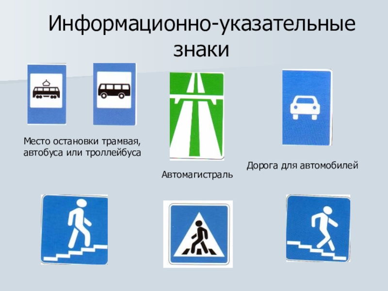Информационно-указательные знакиДорога для автомобилейМесто остановки трамвая, автобуса или троллейбусаАвтомагистраль