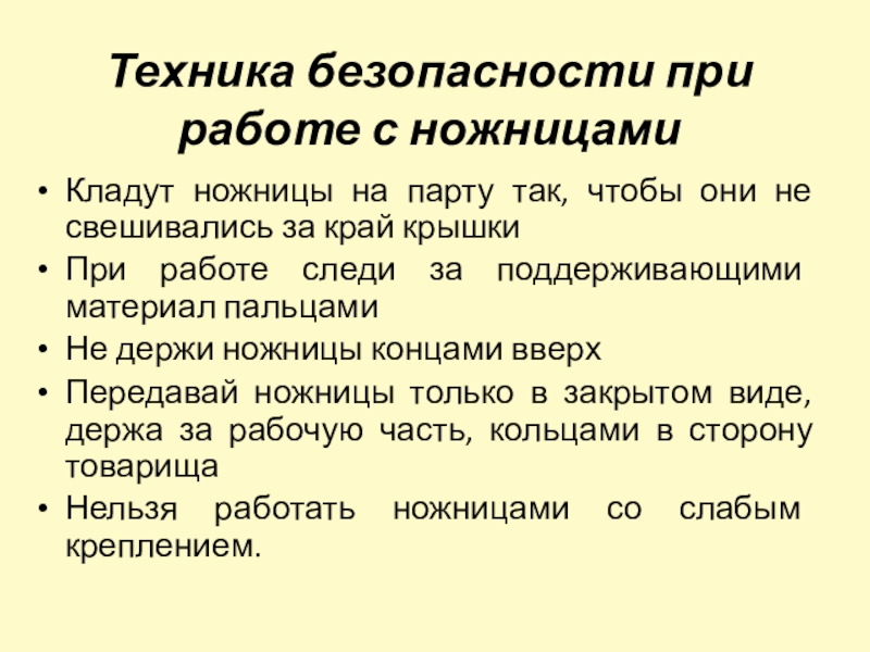 Передавай ножницы только в закрытом виде, держа за рабочую часть, кольцами в сторону товарища