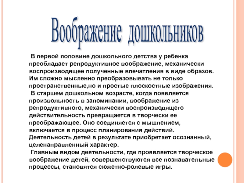 В старшем дошкольном возрасте, когда появляется произвольность в запоминании, воображение из репродуктивного, механически воспроизводящего действительность превращается в творчески ее преображающее. Оно соединяется с мышлением,