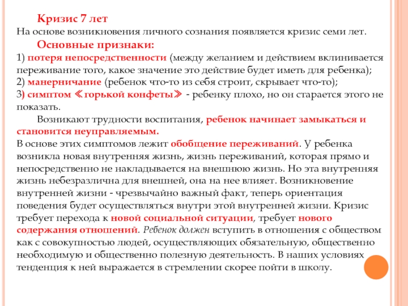 В основе этих симптомов лежит обобщение переживаний. У ребенка возникла новая внутренняя жизнь, жизнь переживаний, которая прямо и непосредственно не накладывается на внешнюю жизнь. Но эта внутренняя жизнь небезразлична для внешней, она на нее влияет. Возникновение внутренней жизни - чрезвычайно важный факт, теперь ориентация поведения будет осуществляться внутри этой внутренней жизни. Кризис требует перехода к новой социальной ситуации, требует нового содержания отношений. Ребенок должен вступить в отношения с обществом как с совокупностью людей, осуществляющих обязательную, общественно необходимую и общественно полезную деятельность. В наших условиях тенденция к ней выражается в стремлении скорее пойти в школу.