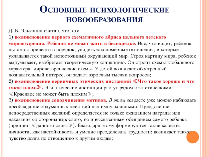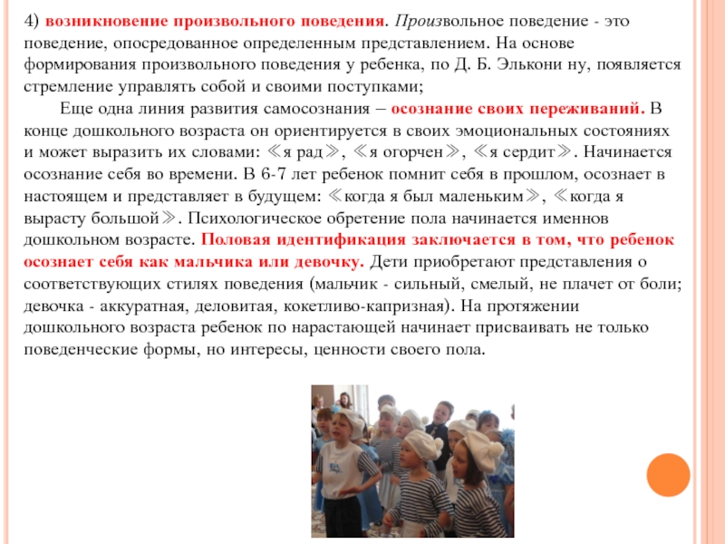 представлением. На основе формирования произвольного поведения у ребенка, по Д. Б. Элькони ну, появляется стремление управлять собой и своими поступками;