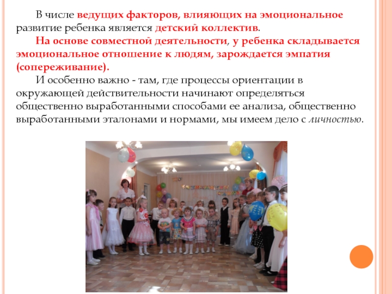 Слайд 8 В числе ведущих факторов, влияющих на эмоциональное развитие ребенка является детский