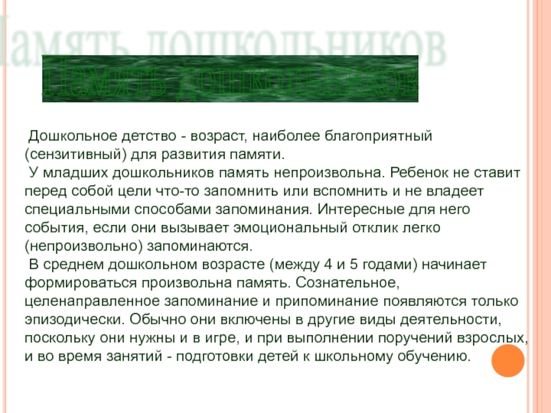 В среднем дошкольном возрасте (между 4 и 5 годами) начинает формироваться произвольна память. Сознательное, целенаправленное запоминание и припоминание появляются только эпизодически. Обычно они включены в другие виды деятельности, поскольку они нужны и в игре, и при выполнении поручений взрослых, и во время занятий - подготовки детей к школьному обучению.