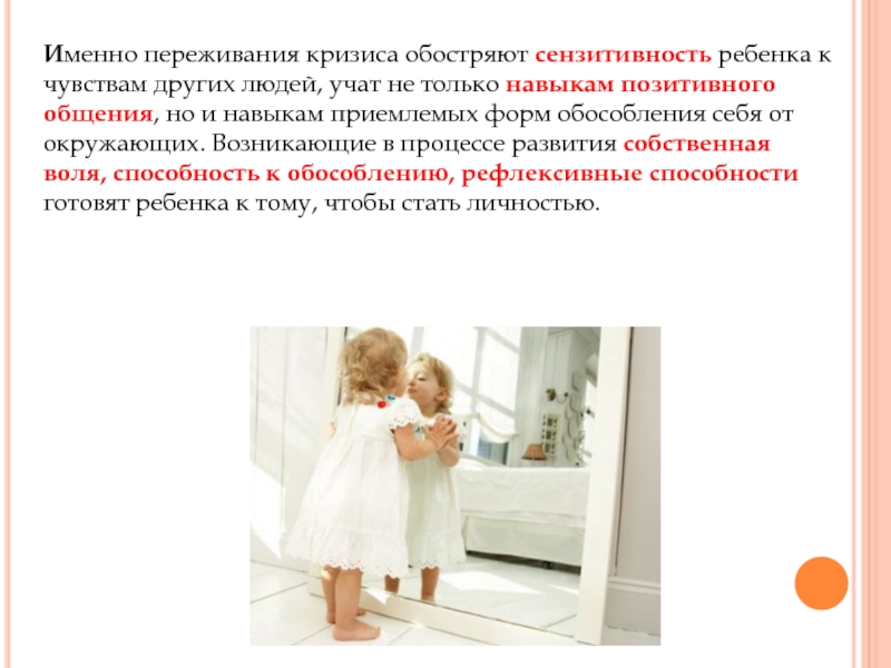 Слайд 5Именно переживания кризиса обостряют сензитивность ребенка к чувствам других людей, учат