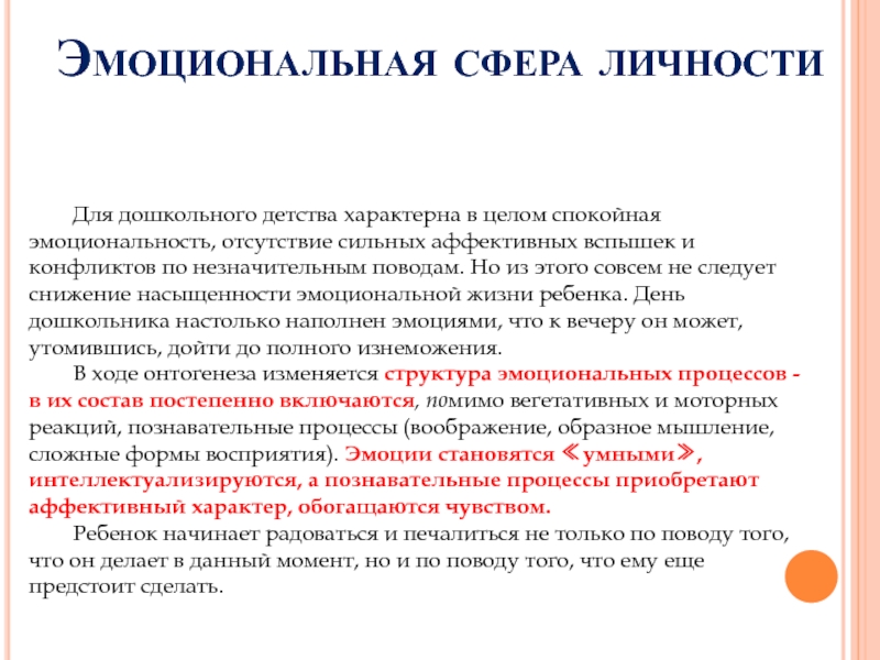 Для дошкольного детства характерна в целом спокойная эмоциональность, отсутствие