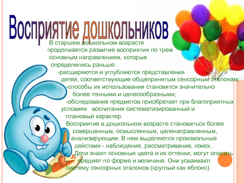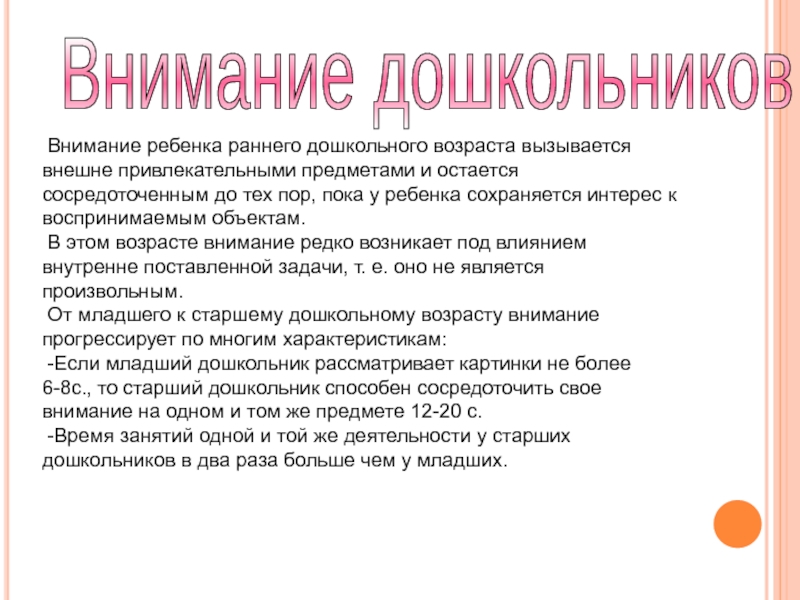 -Если младший дошкольник рассматривает картинки не более 6-8с., то старший дошкольник способен сосредоточить свое внимание на одном и том же предмете 12-20 с.