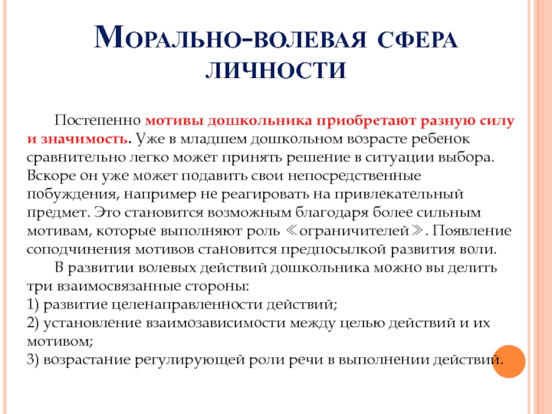 В развитии волевых действий дошкольника можно вы делить три взаимосвязанные стороны:
