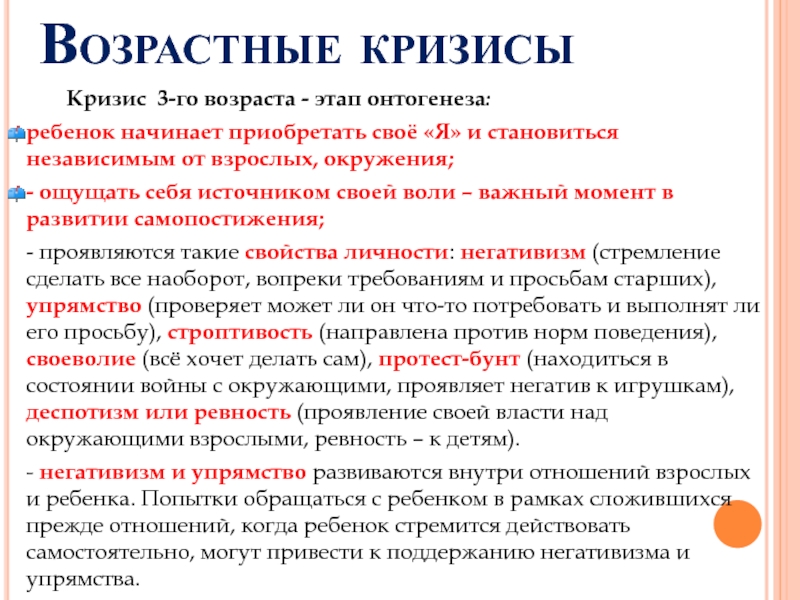- проявляются такие свойства личности: негативизм (стремление сделать все наоборот, вопреки требованиям и просьбам старших), упрямство (проверяет может ли он что-то потребовать и выполнят ли его просьбу), строптивость (направлена против норм поведения), своеволие (всё хочет делать сам), протест-бунт (находиться в состоянии войны с окружающими, проявляет негатив к игрушкам), деспотизм или ревность (проявление своей власти над окружающими взрослыми, ревность – к детям).