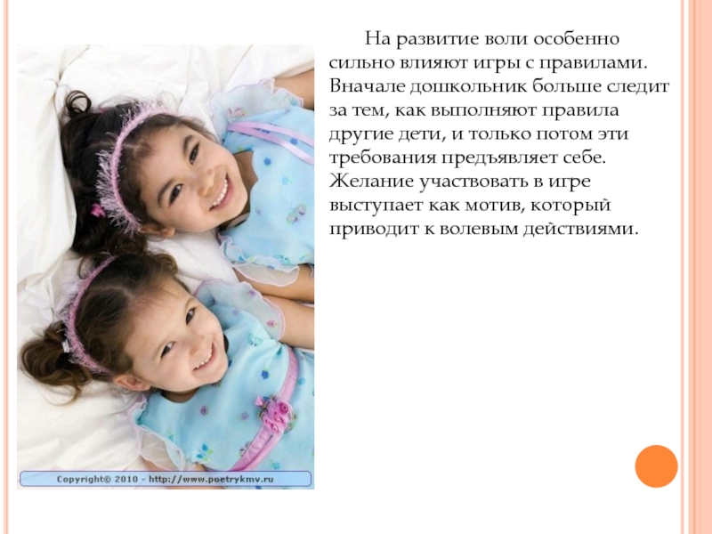 Слайд 10 На развитие воли особенно сильно влияют игры с правилами. Вначале дошкольник
