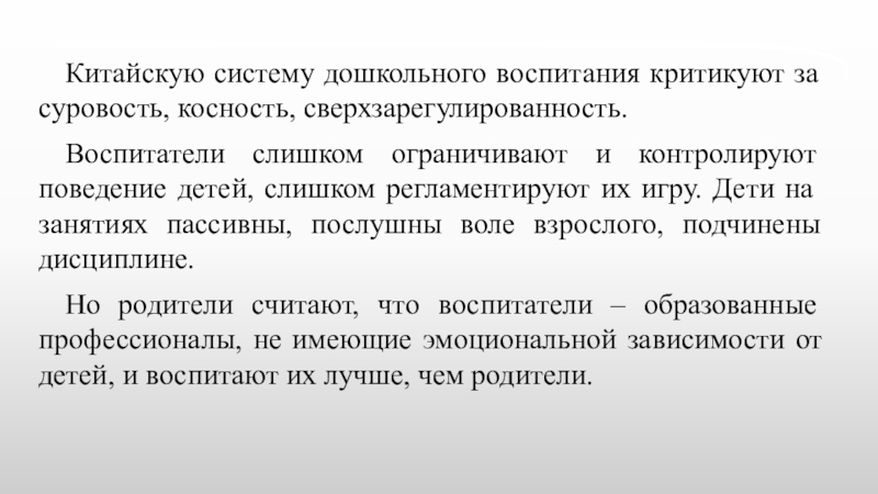 Слайд 11Китайскую систему дошкольного воспитания критикуют за суровость, косность, сверхзарегулированность.
