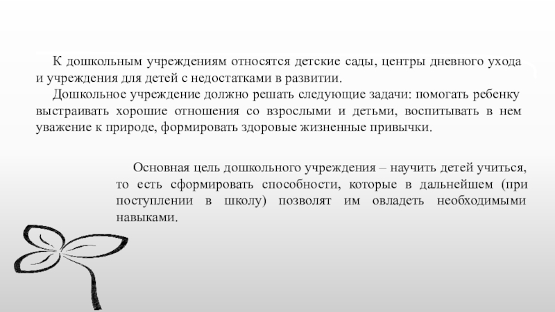 Слайд 5К дошкольным учреждениям относятся детские сады, центры дневного ухода и учреждения