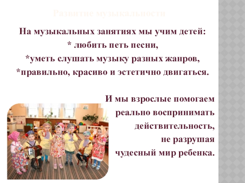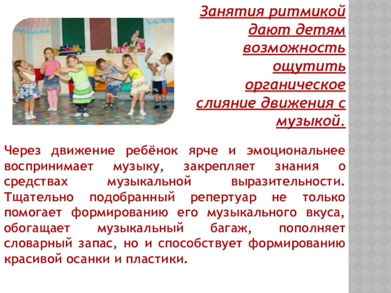 Занятия ритмикой дают детям возможность ощутить органическое слияние движения с музыкой.