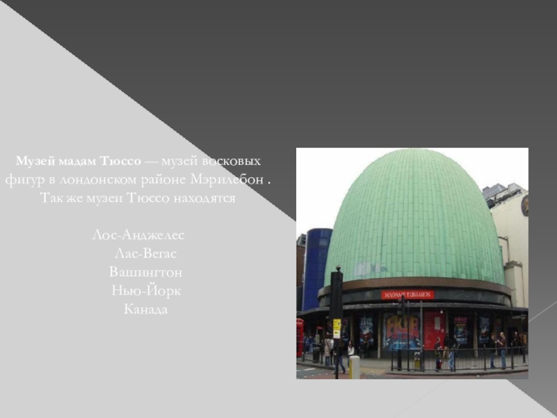 Музей Мадам ТюссоМузей мадам Тюссо — музей восковых фигур в лондонском районе Мэрилебон .Так же музеи Тюссо