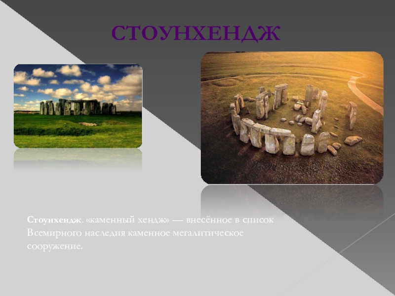 СТОУНХЕНДЖСтоунхендж. «каменный хендж» — внесённое в список Всемирного наследия каменное мегалитическое сооружение.