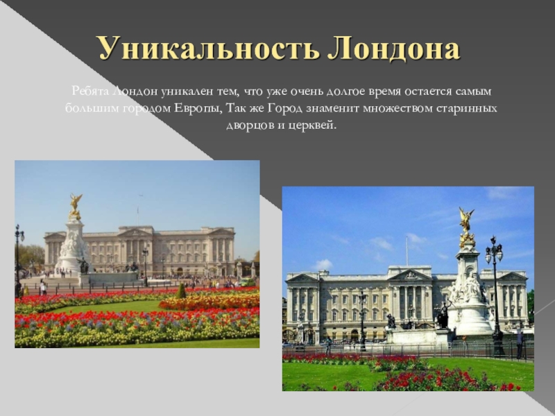 Ребята Лондон уникален тем, что уже очень долгое время остается самым большим городом Европы, Так же Город знаменит множеством старинных дворцов и церквей.