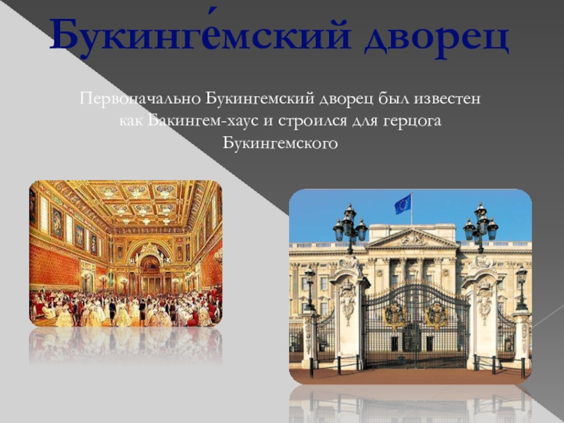 Букинге́мский дворецПервоначально Букингемский дворец был известен как Бакингем-хаус и строился для герцога Букингемского