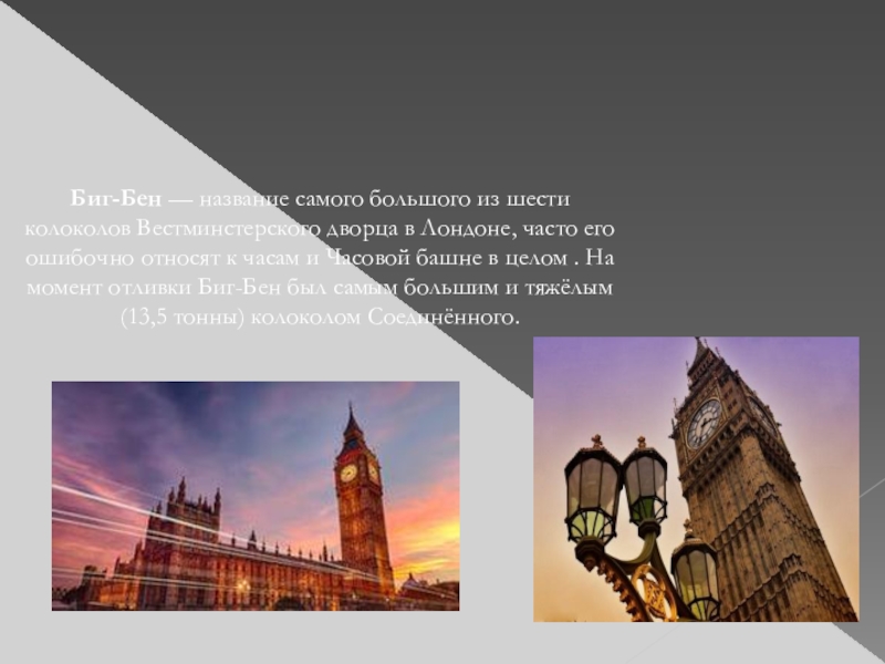 в Лондоне, часто его ошибочно относят к часам и Часовой башне в целом . На момент отливки Биг-Бен был самым большим и тяжёлым (13,5 тонны) колоколом Соединённого.