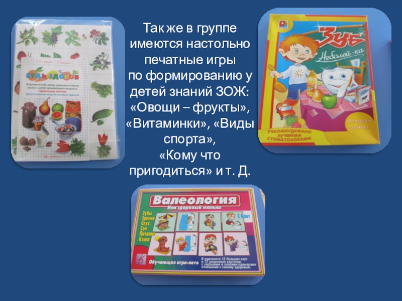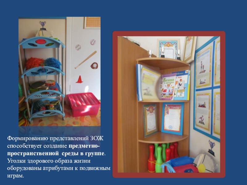 Слайд 6Формированию представлений ЗОЖ способствует создание предметно-пространственной среды в группе. Уголки здорового образа